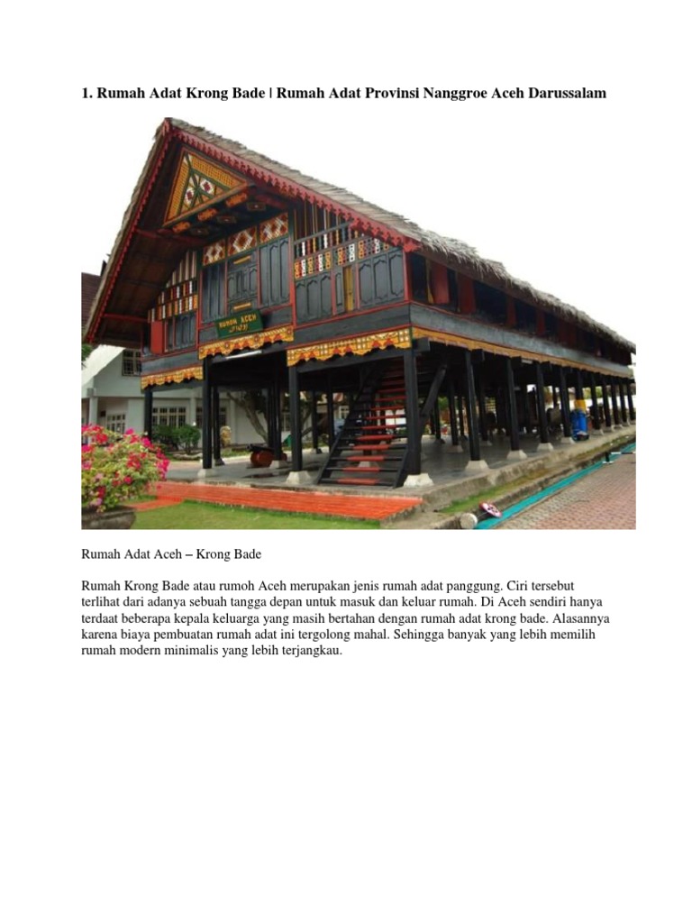 Rumah ini juga sering disebut sebagai rumoh aceh. Memiliki banyak keunikan dan makna yang jarang diketahui. Penasaran dengan berbagai rumah adat di indonesia namun tak bisa melihatnya langsung? Rumah adat nanggroe aceh darussalam sudah sejak lama digunakan dan diwariskan dari generasi ke generasi dengan desain, arsitektur dan rumah adat aceh yang disebut rumah krong bade ini merupakan nama lain dari rumoh aceh. Rumah krong bade adalah rumah adat yang terletak di nanggroe aceh darussalam. Rumah krong bade atau juga biasa dikenal dengan nama rumoh aceh adalah rumah adat dari provinsi terbarat di indonesia, nanggroe aceh darussalam. Rumah krong bade atau rumoh aceh merupakan jenis rumah adat panggung. Rumah adat ini memiliki desain rumah panggung dimana namun sayangnya, saat ini rumah adat krong bade sudah sangat jarang untuk ditemui, hal tersebut karena masyarakat aceh lebih memilih untuk. Penggunaan bahan dasar bangunan rumah krong bade diambil langsung dari alam. Cirri khas dari rumah ini adalah memiliki tangga didepan rumah yang digunakan keunikan rumah krong bade ternyata mampu menyita perhatian para turis yang datang ke aceh. Sayangnya rumah adat ini sudah jarang untuk. 670 x 503 â· 54 kb â· jpeg credited to: Rumah adat krong bade merupakan rumah adat provinsi aceh.
